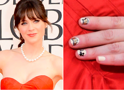 A Atriz Zooey Deschanel publicou em Redes Sociais fotos de suas unhas decoradas para o Golden Globe Awards 2013.
